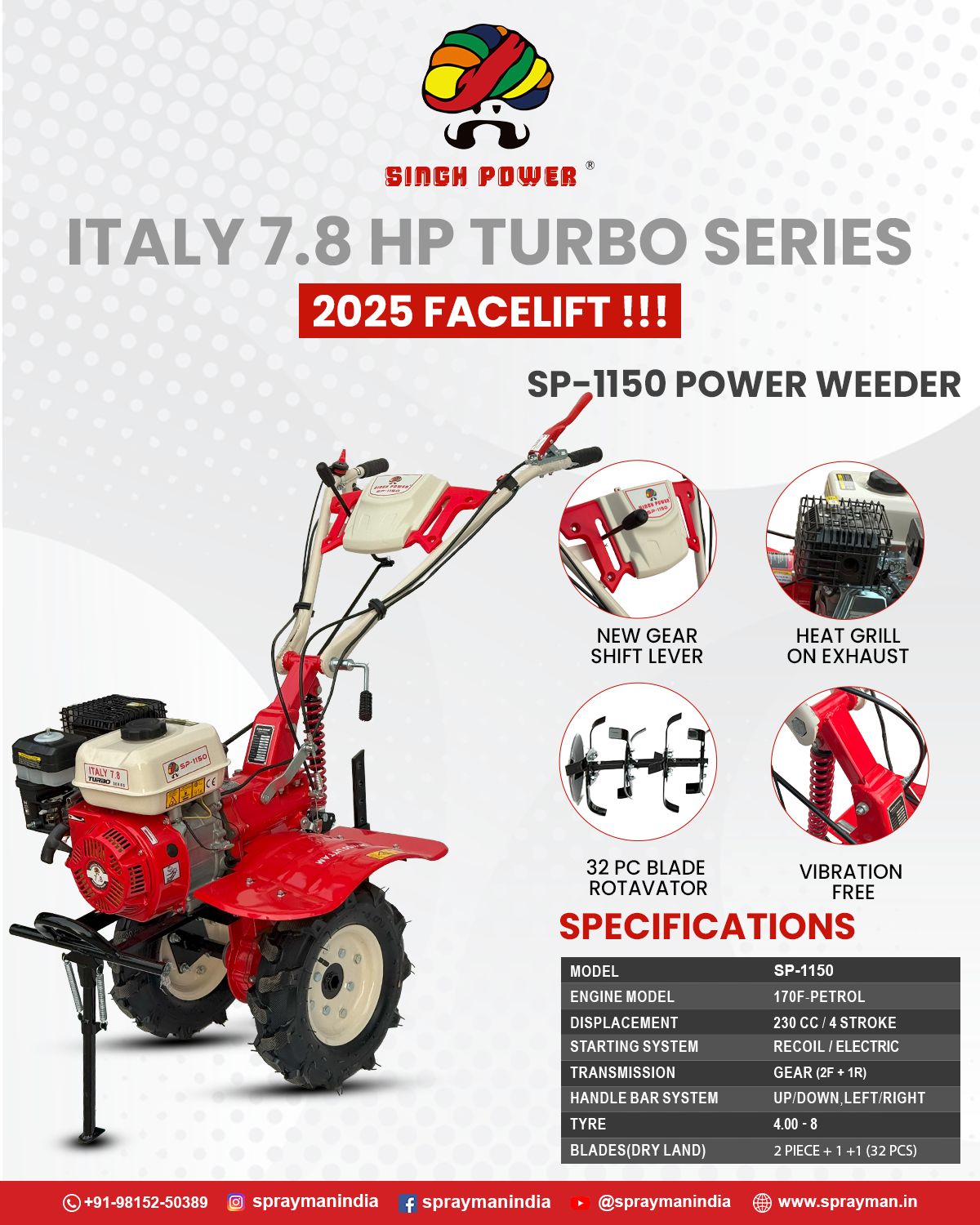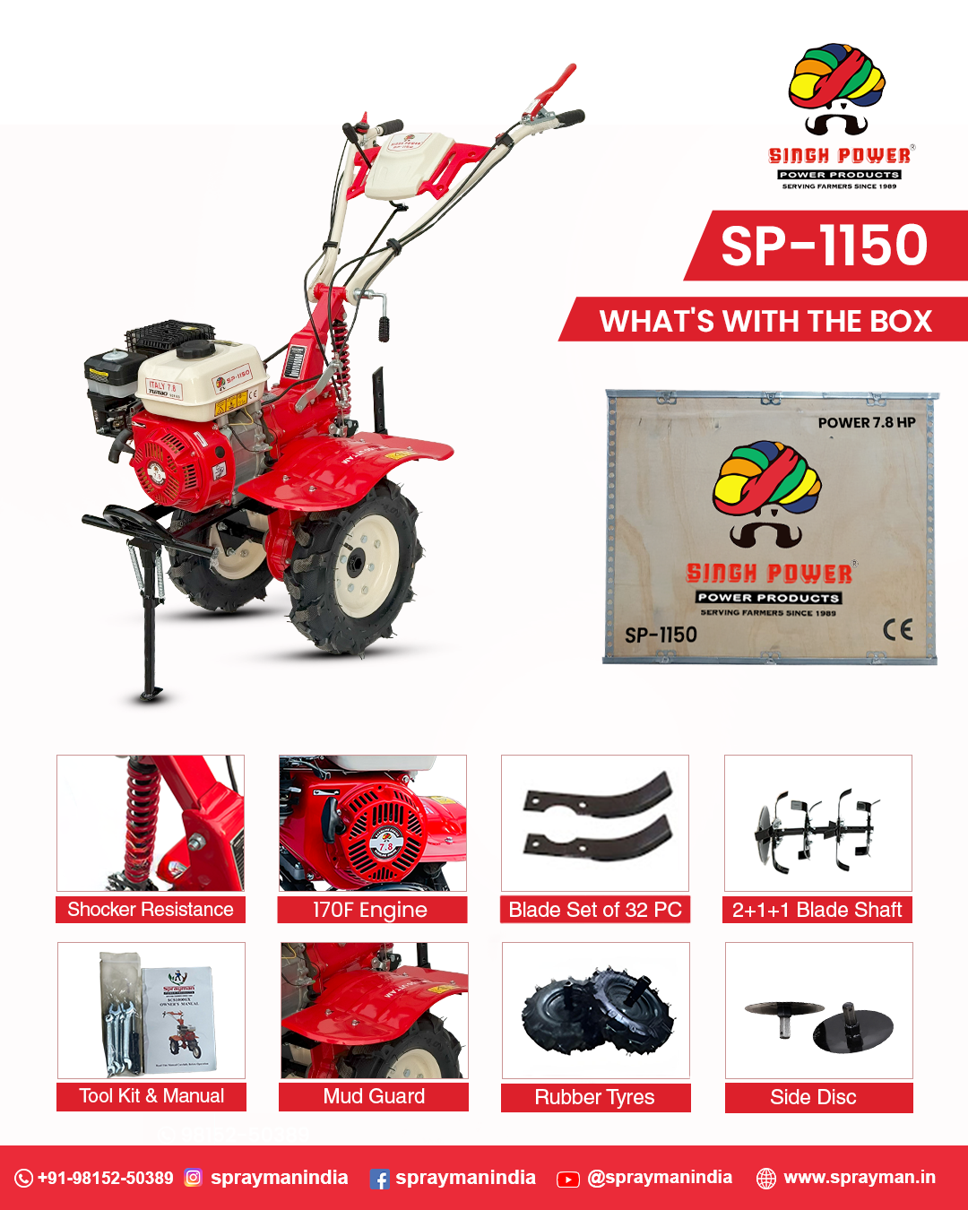 The Singh Power SP-1150 Power Weeder is built to handle challenging farming conditions with ease. Equipped with a 220cc petrol engine delivering 7.8 HP, it ensures powerful performance and fuel efficiency for long hours of field work.